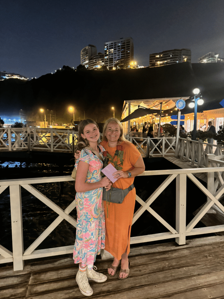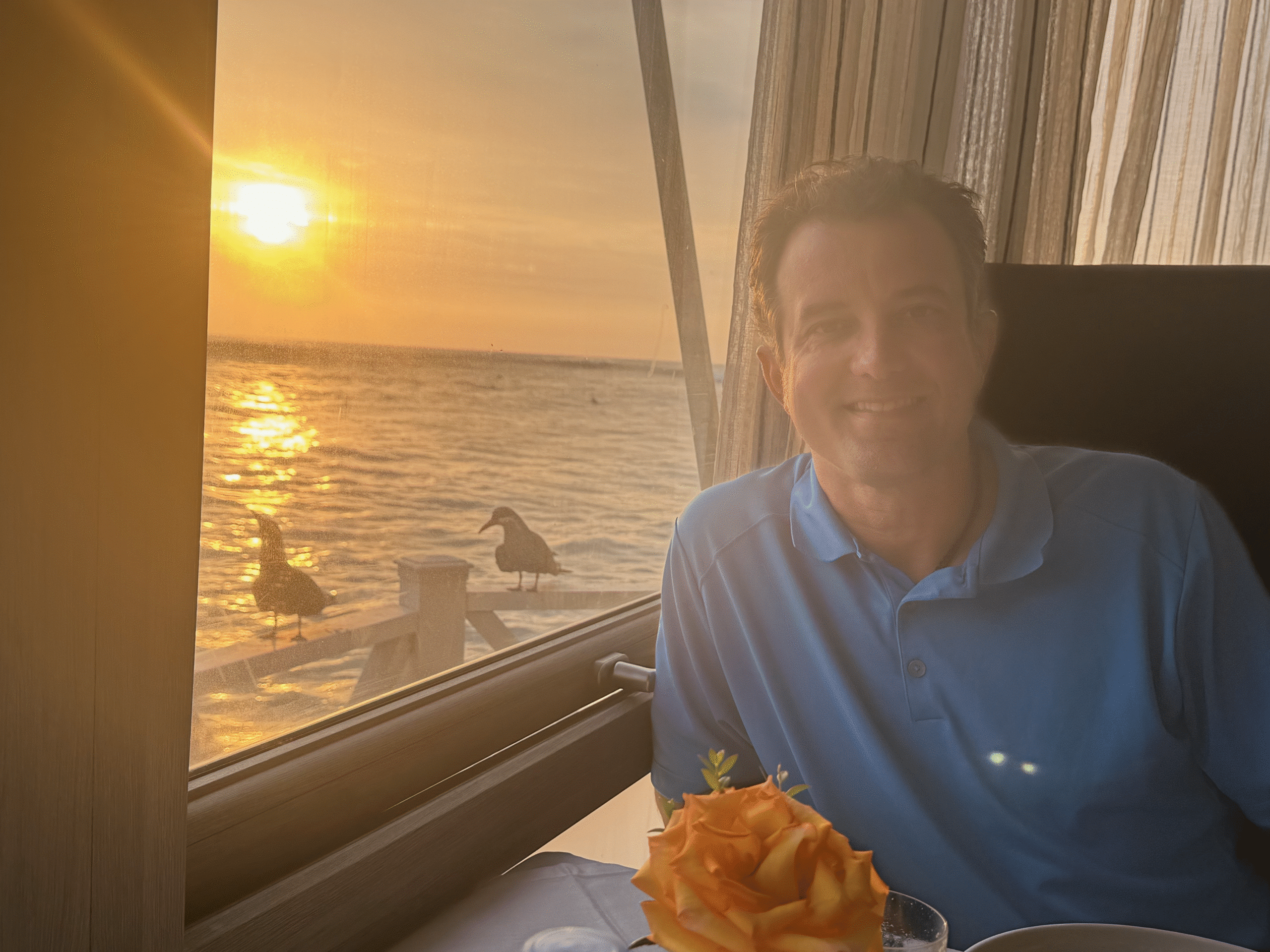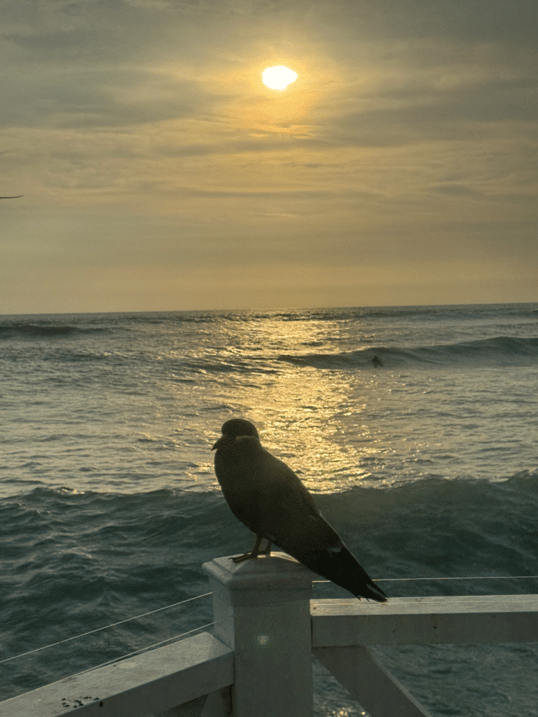 La Rosa Nautica was incredible. The ladies were handed flowers at the door, and we were escorted to a table overlooking the ocean just in time for sunset. Below us, surfers in wetsuits caught the high tide, while countless Incan terns nested and wheeled around the pier beneath us. Bread for Charlie, Amy found many wines to choose from, and I did my usual maneuver of trying to dodge the vegetables on my plate, but the server gently explained that in Peruvian cuisine, everything on the plate is intentional—and strongly encouraged me to eat them. Fair enough.